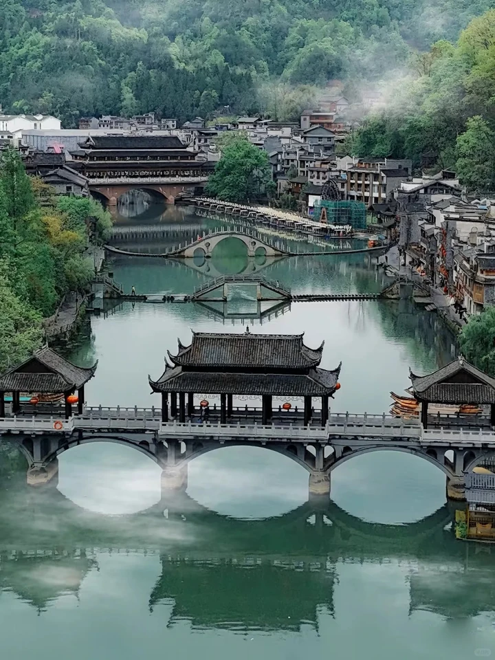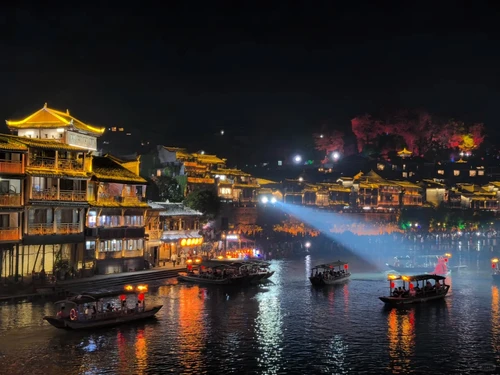 봉황고성의 야경은 눈부시며, 반짝이는 타강, 기둥집의 반사된 불빛, 반짝이는 네온사인이 고요함과 환상을 보여줍니다.