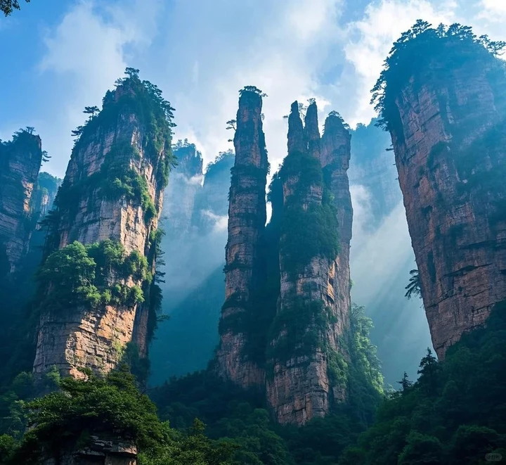 아침 식사 후, 창사를 떠나 장가계 국가삼림공원으로 향했습니다. 장가계는 3천 개의 독특한 봉우리와 800개의 에메랄드빛 시냇물이 흐르는 곳으로, 세계적으로도 매우 희귀한 사암 봉우리 삼림 지형을 자랑합니다.