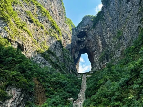 천문산 풍경구에서 출발하여 1,000m 높이의 절벽을 가르는 천문동을 감상할 수 있습니다. 케이블카를 타고 주변 봉우리와 깊은 계곡의 탁 트인 전망을 감상할 수도 있습니다.